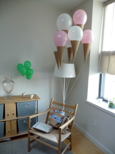 Pour les anniversaires, on cherche toujours à tout décorer, c’est tellement plus joli de faire plein de belles choses. Surtout si les mini bouts sont en age d’inviter leurs copains et copines, cela permet d’épater les enfants et de voir leurs yeux qui brillent ce qui n’a pas de prix (pour tout le reste il y a Eurocard/Mastercard LOL). Et puis accessoirement cela peut épater la galerie surtout les personnes qui ne sont pas très manuelles … Voici une idée toute simple à réaliser … des cornets de glace avec des ballons gonflables (si possible gonflés à l’hélium), idée trouvée sur le site Oh Happy Day