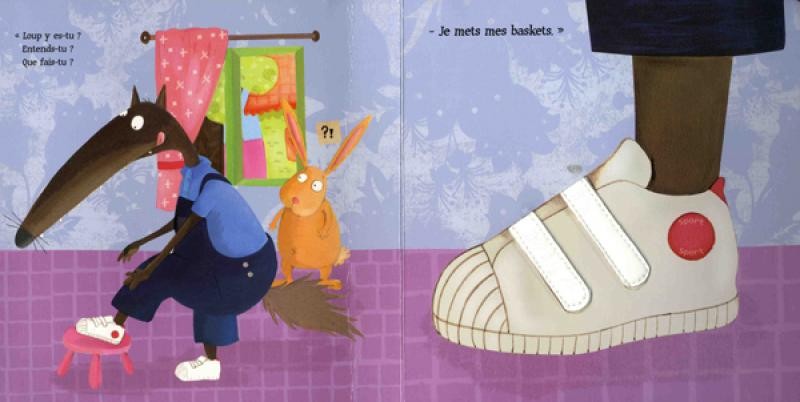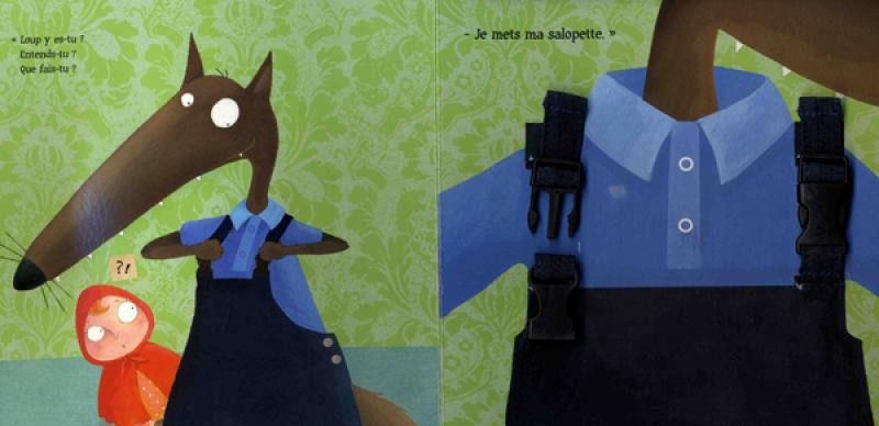 Sur l’air de la comptine « Loup, y es-tu » [que Crapouille chante si bien !!], on voit au fil des pages Petit Loup qui s’habille, et qui enfile un nouveau vêtement à chaque page, en réponse aux trois petits cochons inquiets qui répètent « Loup y es-tu ? Que fais-tu ? »