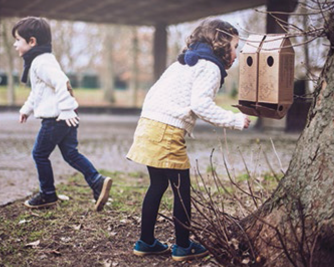 La boite à chaussure d’enfant se transforme quant à elle en un nichoir à oiseaux avec juste quelques coups de ciseaux (une activité ludique à réaliser seul ou avec l’aide d’un adulte),