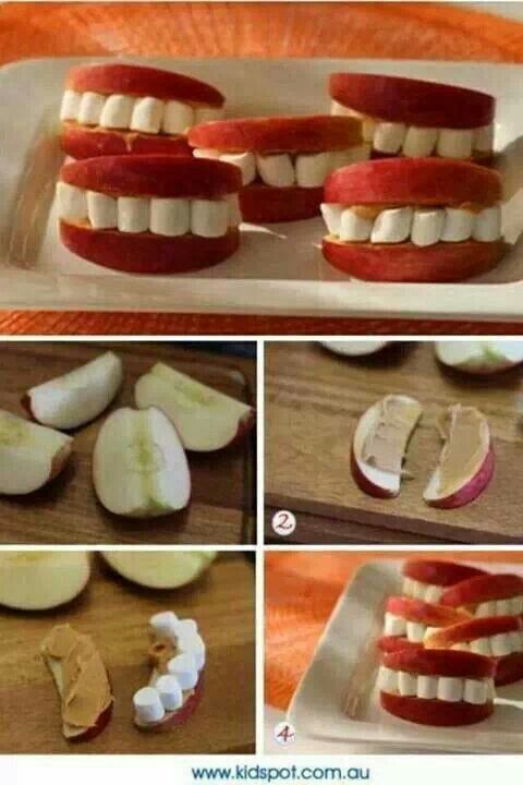 Les quartiers de pomme qui se prennent pour des dentiers 😉 grâce à des marshmallows et de la pâte à tartiner ! (source ici)