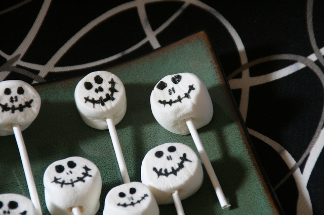 L’idée des chamallows plantés sur les piques sur lesquels on a dessiné des petits fantômes 😉 Vous trouverez la source ici.