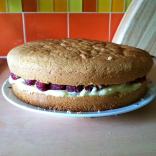 – Mes essais de gâteau pour l’anniversaire de Numérobis (Génoise fourrée à la crème pâtissière au chocolat et recouverte de chocolat & génoise fourrée à la crème pâtissière vanille avec des framboises)