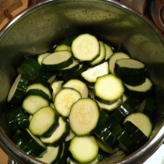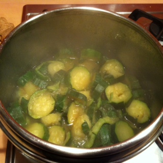 Commence par faire cuire tes courgettes coupées en grosses rondelles dans le bouillon.