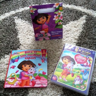 Et pour les petits fans de Dora, tu pourras trouver tout plein de produits dérivés tel que des figurines, des livres, des coloriages, des DVDs, des peluches, etc …