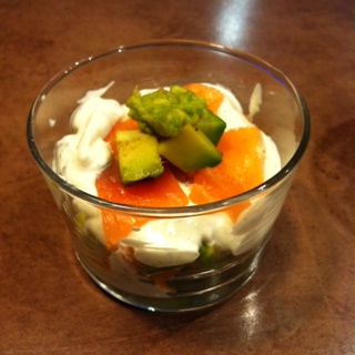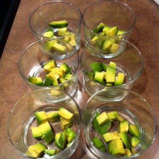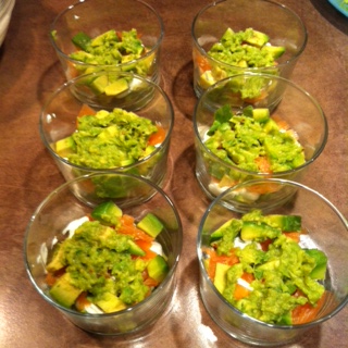 Mettre des cubes d’avocat, puis un peu de guacamole, ensuite le fromage frais et le saumon fumé et recommencer un seconde fois en terminant par le saumon fumé sur lequel on rajoute un peu d’avocat pour la présentation.
