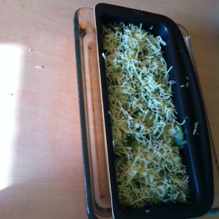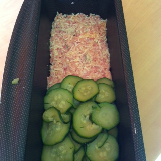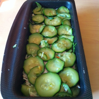 Commences par une couche de courgettes, une couche du mélange au jambon, si tu as du cheddar, places le ici, puis à nouveau courgettes, mélange au jambon, … En terminant par les courgettes 🙂