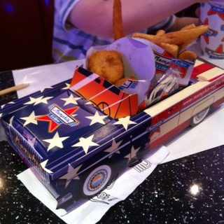On a été au restaurant Memphis avec un chouette menu enfant présenté dans une belle voiture en carton 😉