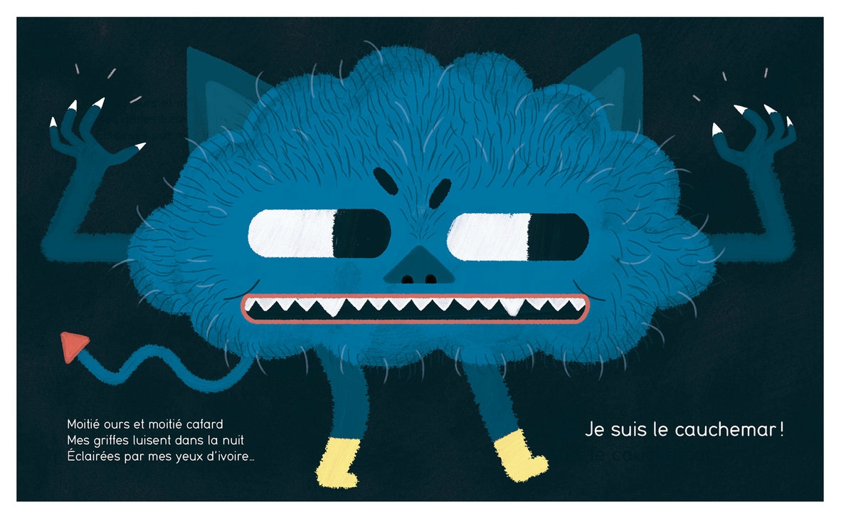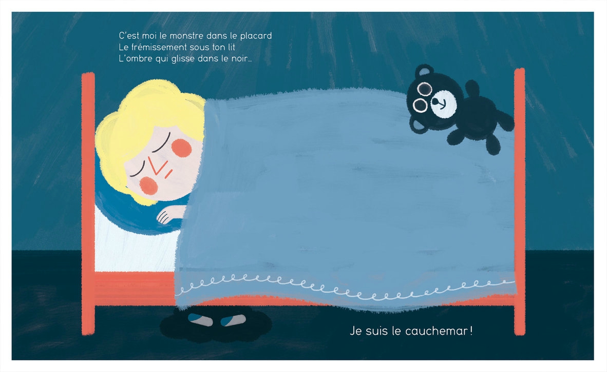 Mais lorsque celui-ci se réveille, papa et maman viennent pour le rassurer et lui faire un câlin et des bisous …. Bref tout ce que déteste le cauchemar qui finit par disparaître en disant « J’étais le cauchemar »