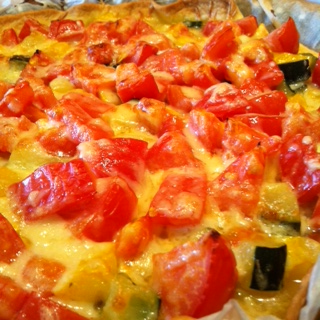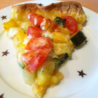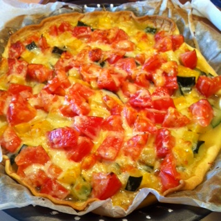 Ce sont juste des légumes « jetés » sur une pâte brisée avec du fromage pour gratiner le tout, c’est donc assez light car on ne rajoute pas d’œuf et de crème pour alourdir l’ardoise des calories 🙂