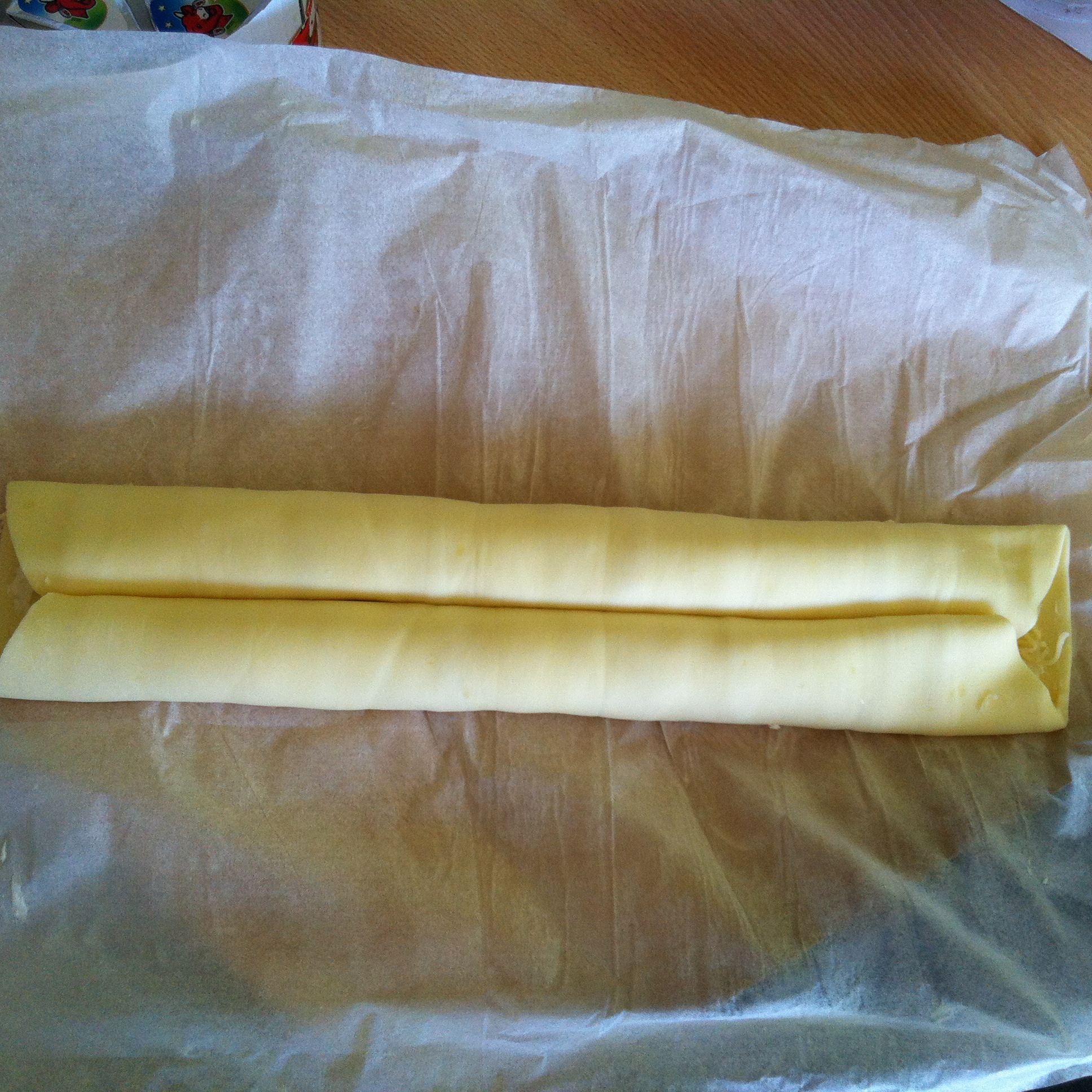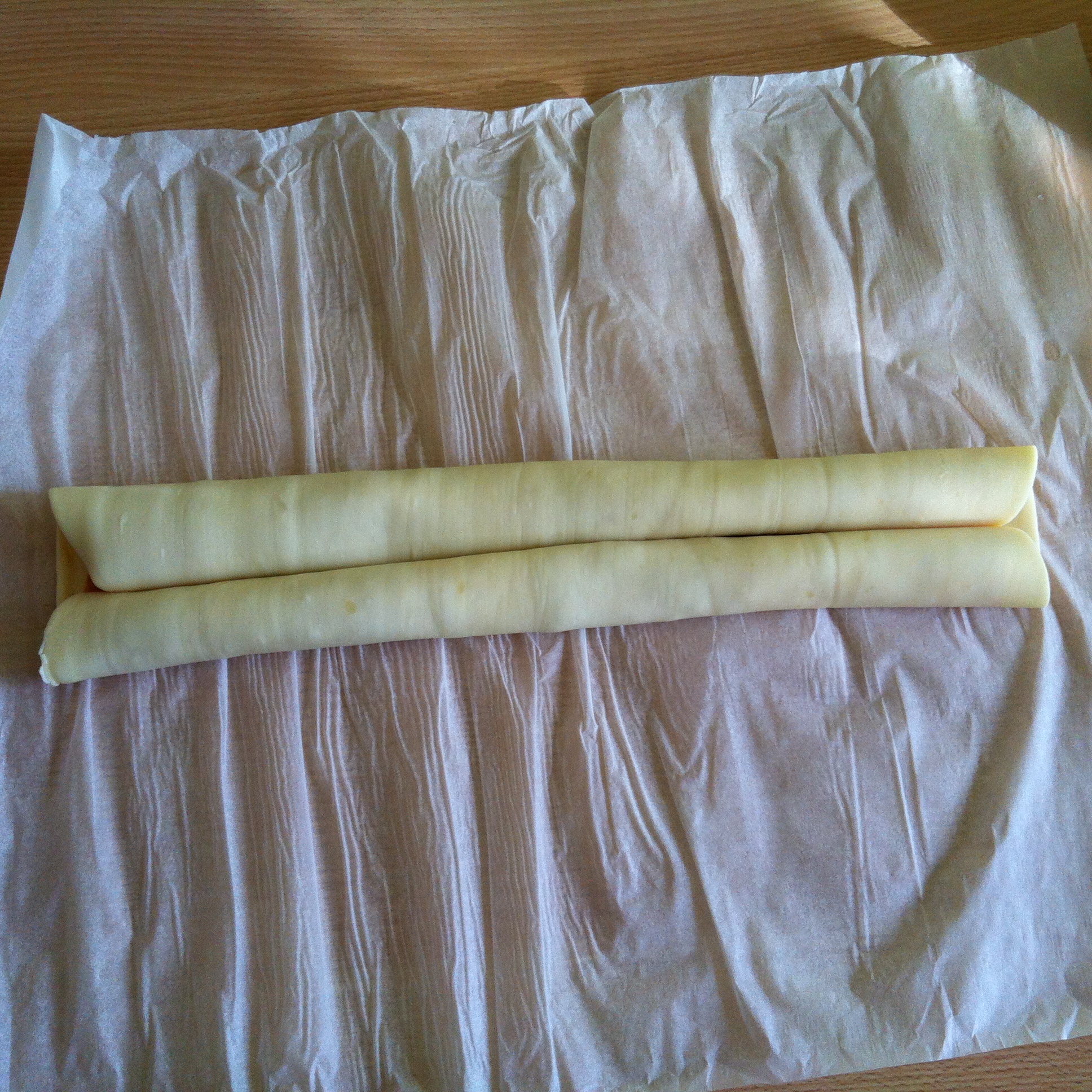 Ensuite, partez d’un bord et roulez la pâte jusqu’au milieu, puis recommencer de l’autre côté pour obtenir deux boudins comme sur les photos ci-dessous …