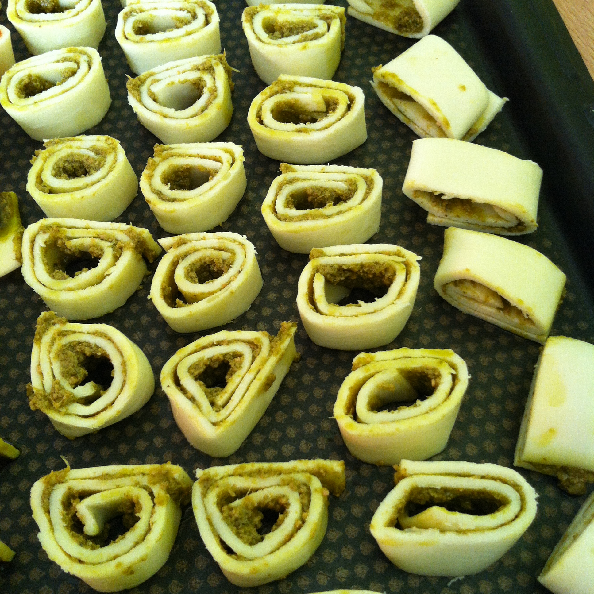 Puis tartiner la d’une couche de pesto vert pour la première pâte feuilletée, de pesto rouge pour la seconde