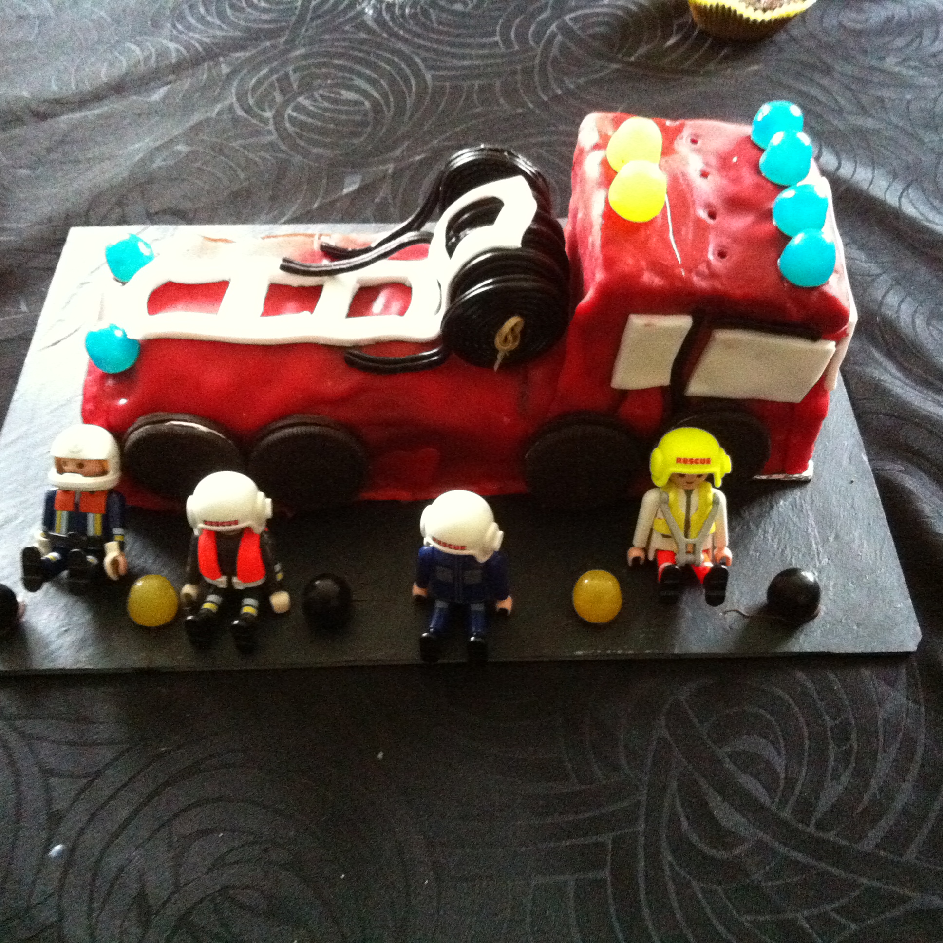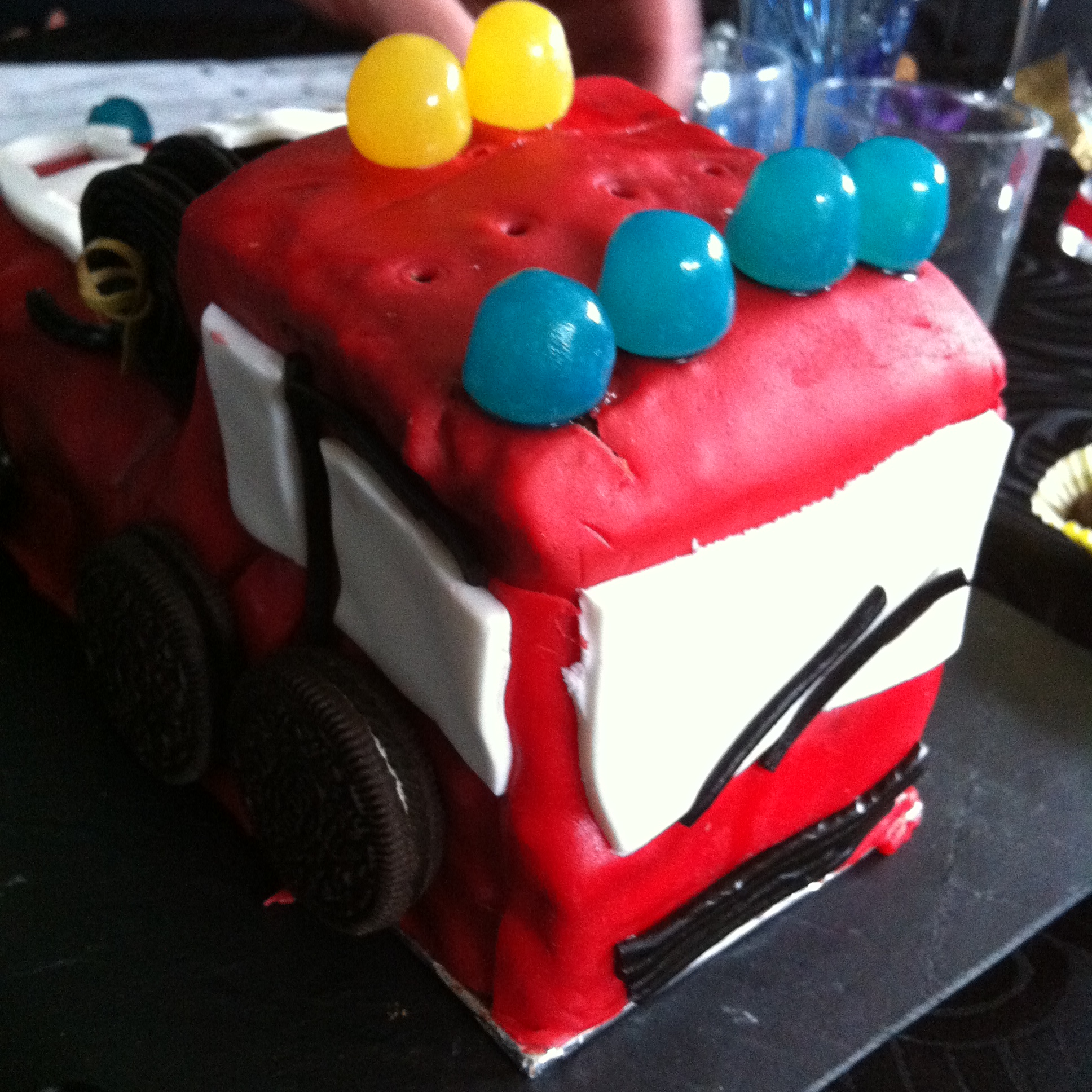 Donc pour son anniversaire, nous lui avons réalisé un gâteau en forme de camion de pompier avec l’aide de pâte à sucre !