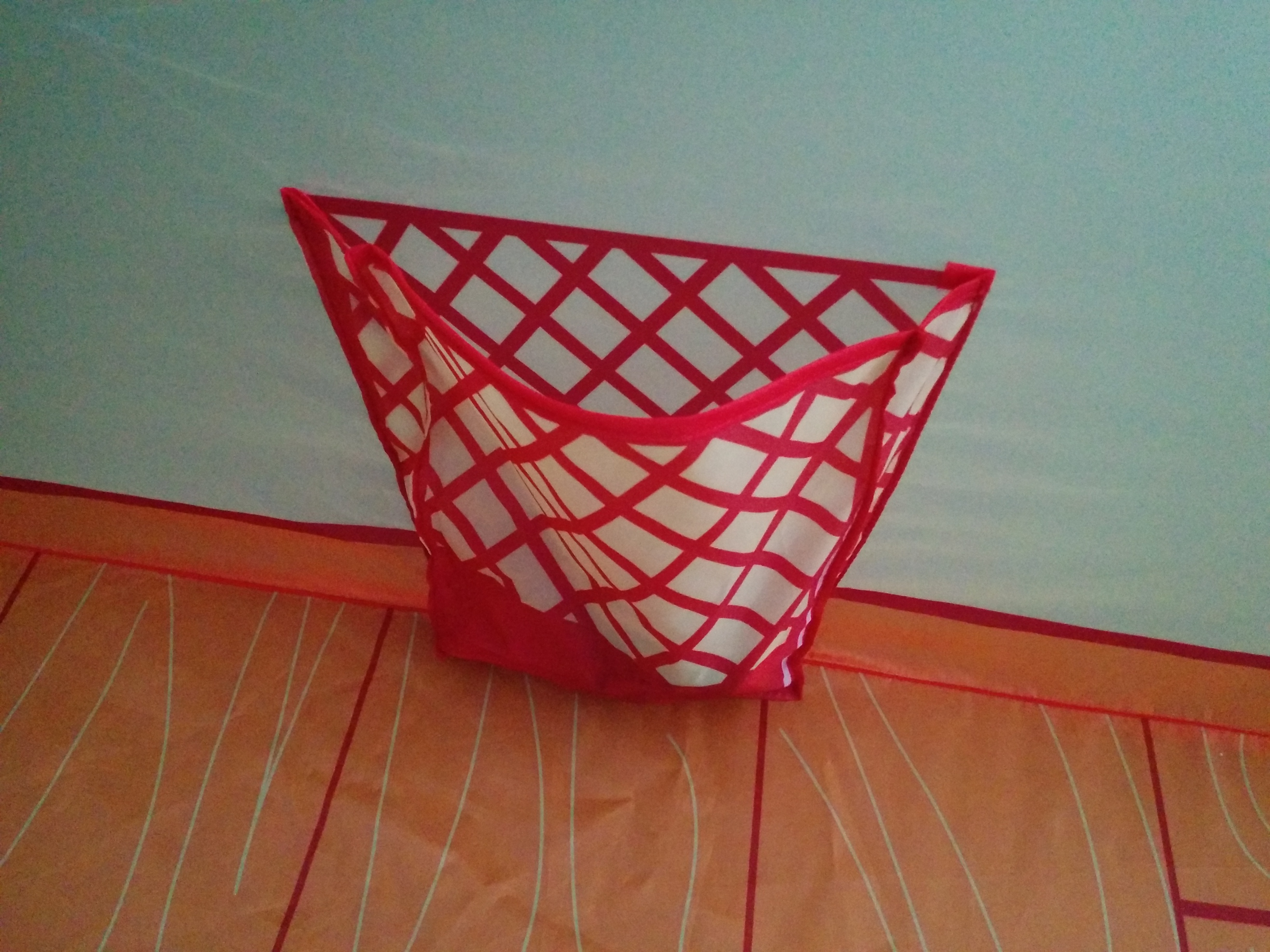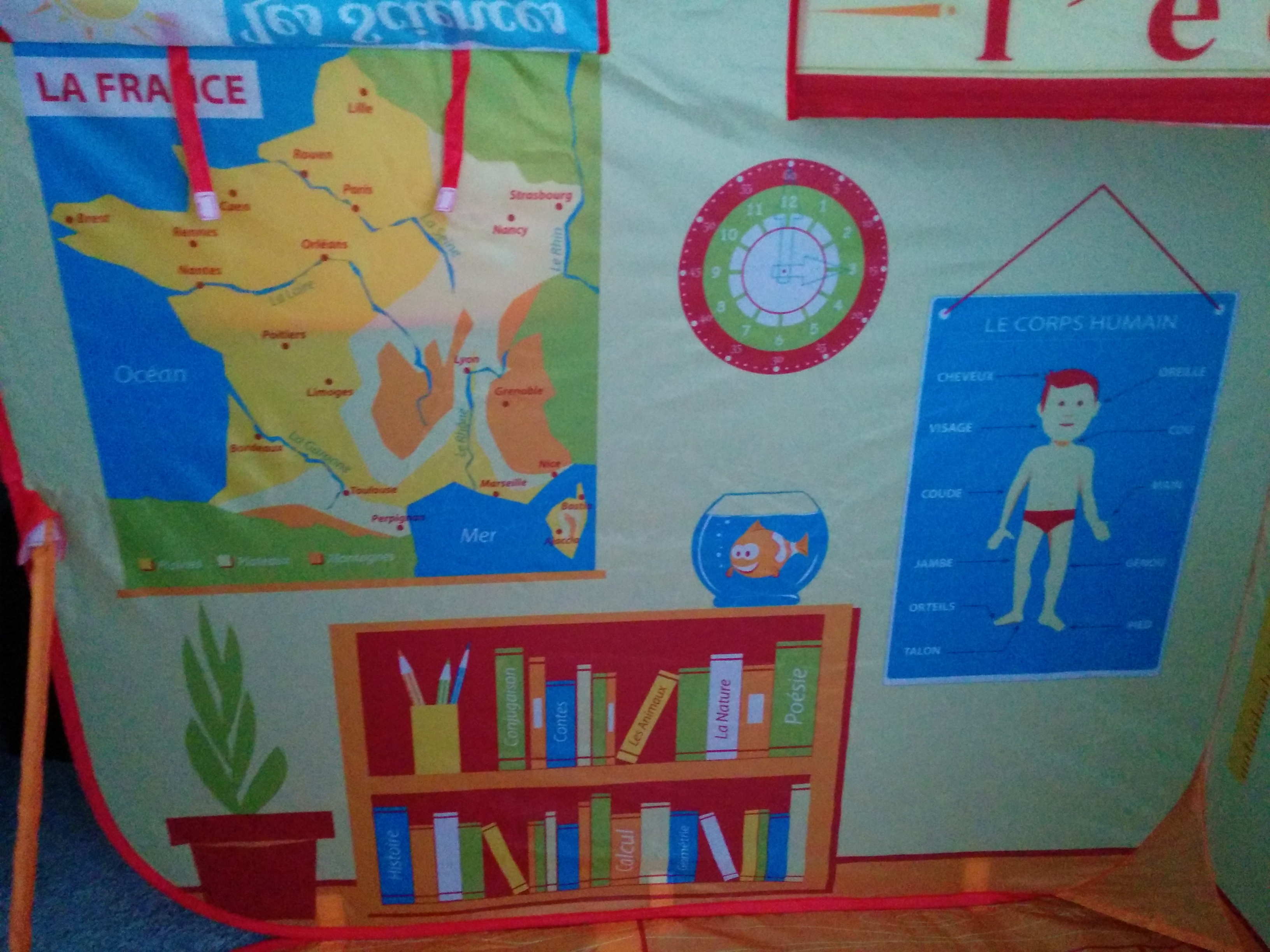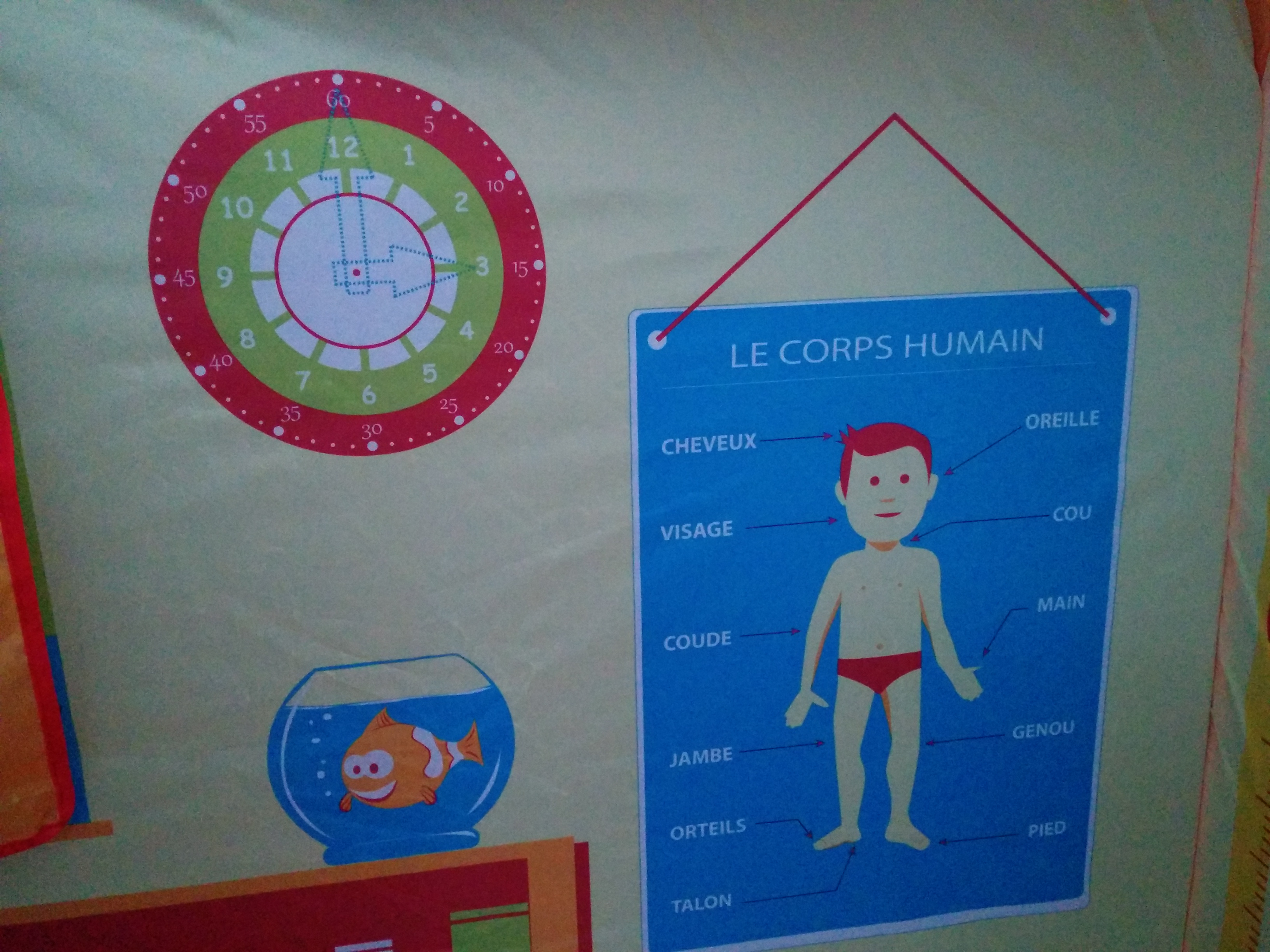 La tente se compose de plusieurs éléments, tel le tableau, les pochettes pur mettre les dessins, la corbeille, même le poisson rouge barbotant dans son aquarium etc …