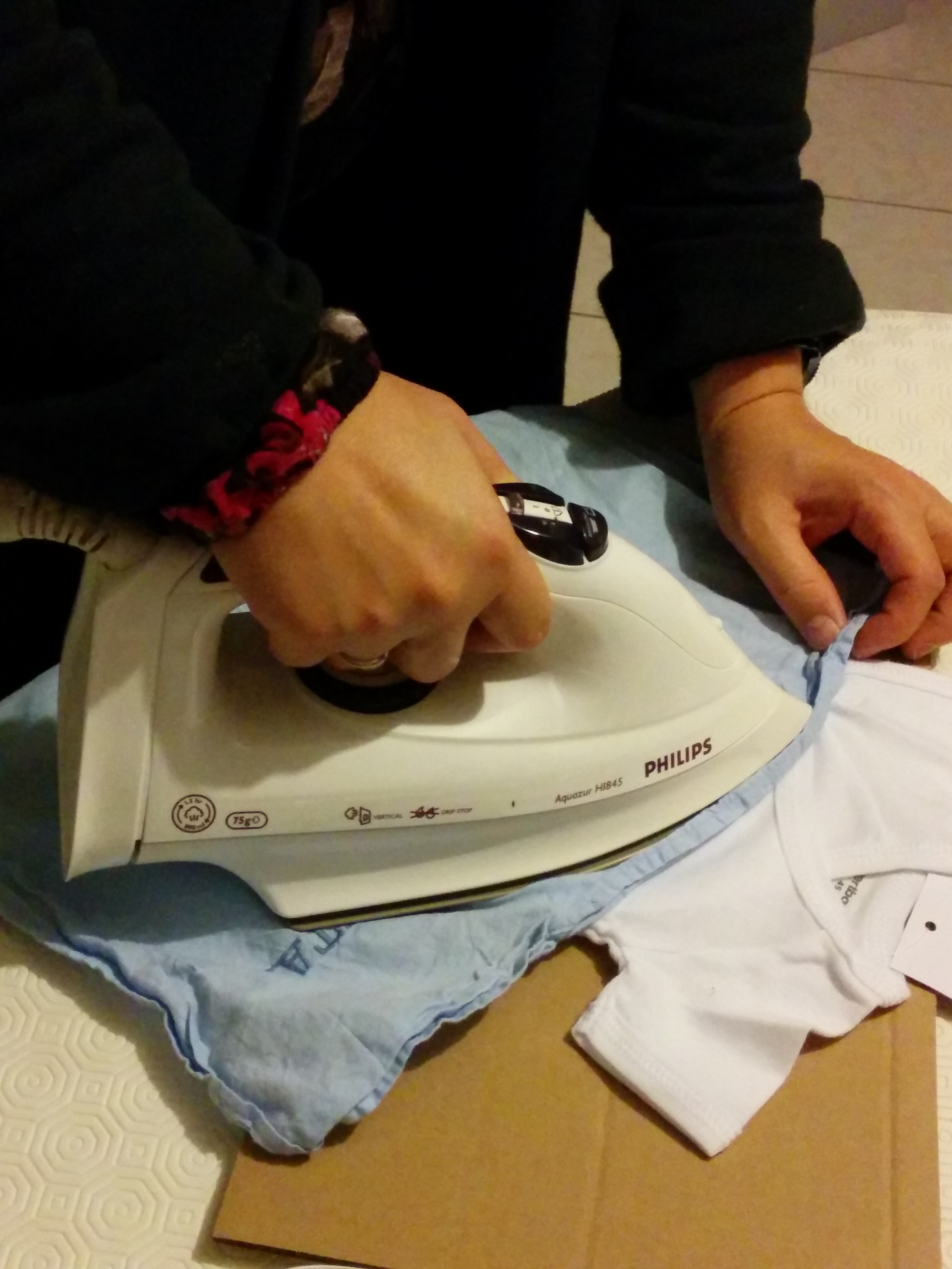 Couvrez votre motif d’un tissu fin et repassez avec votre fer (en position coton et surtout sans vapeur !) pendant environ 30 secondes.