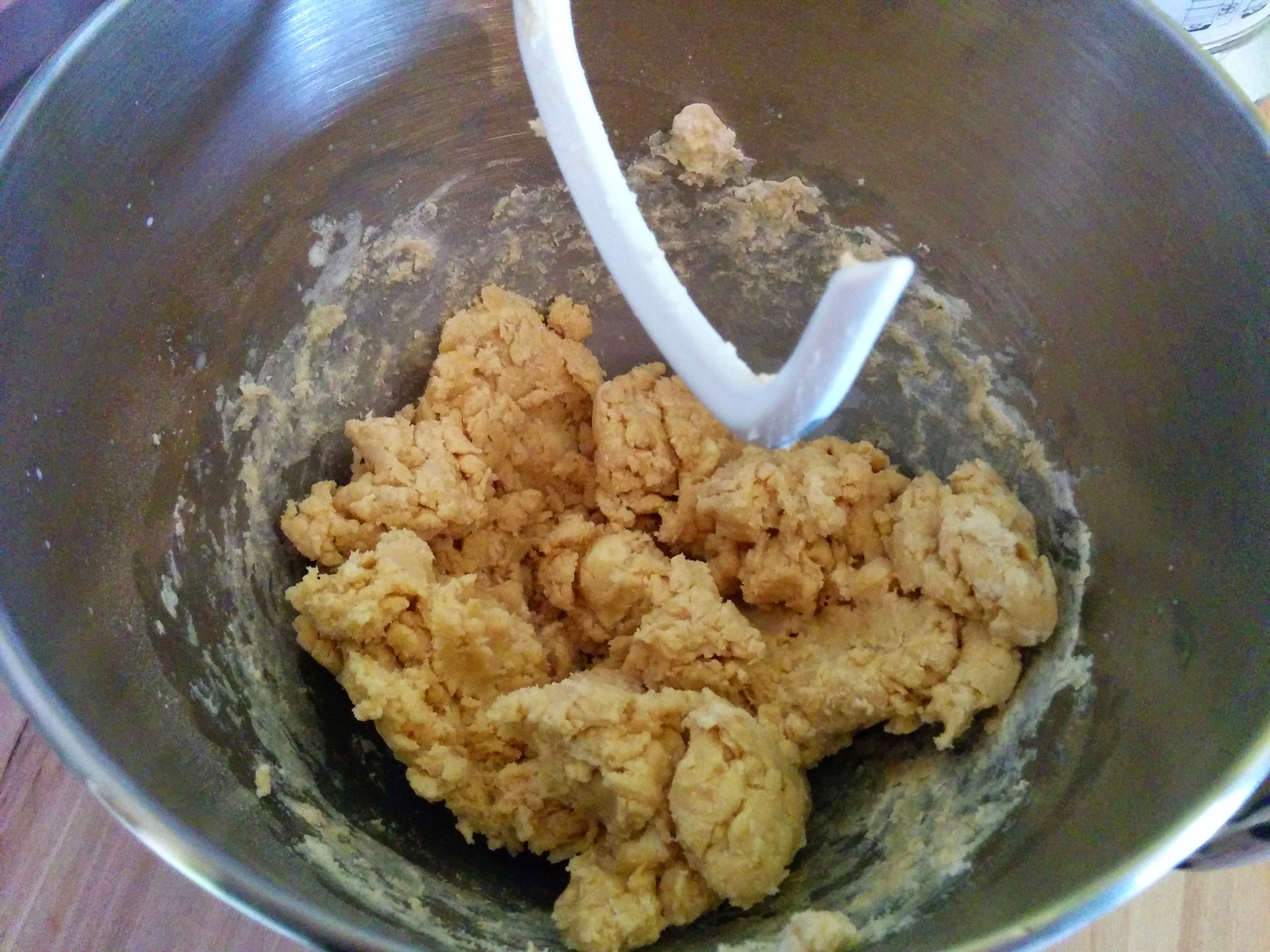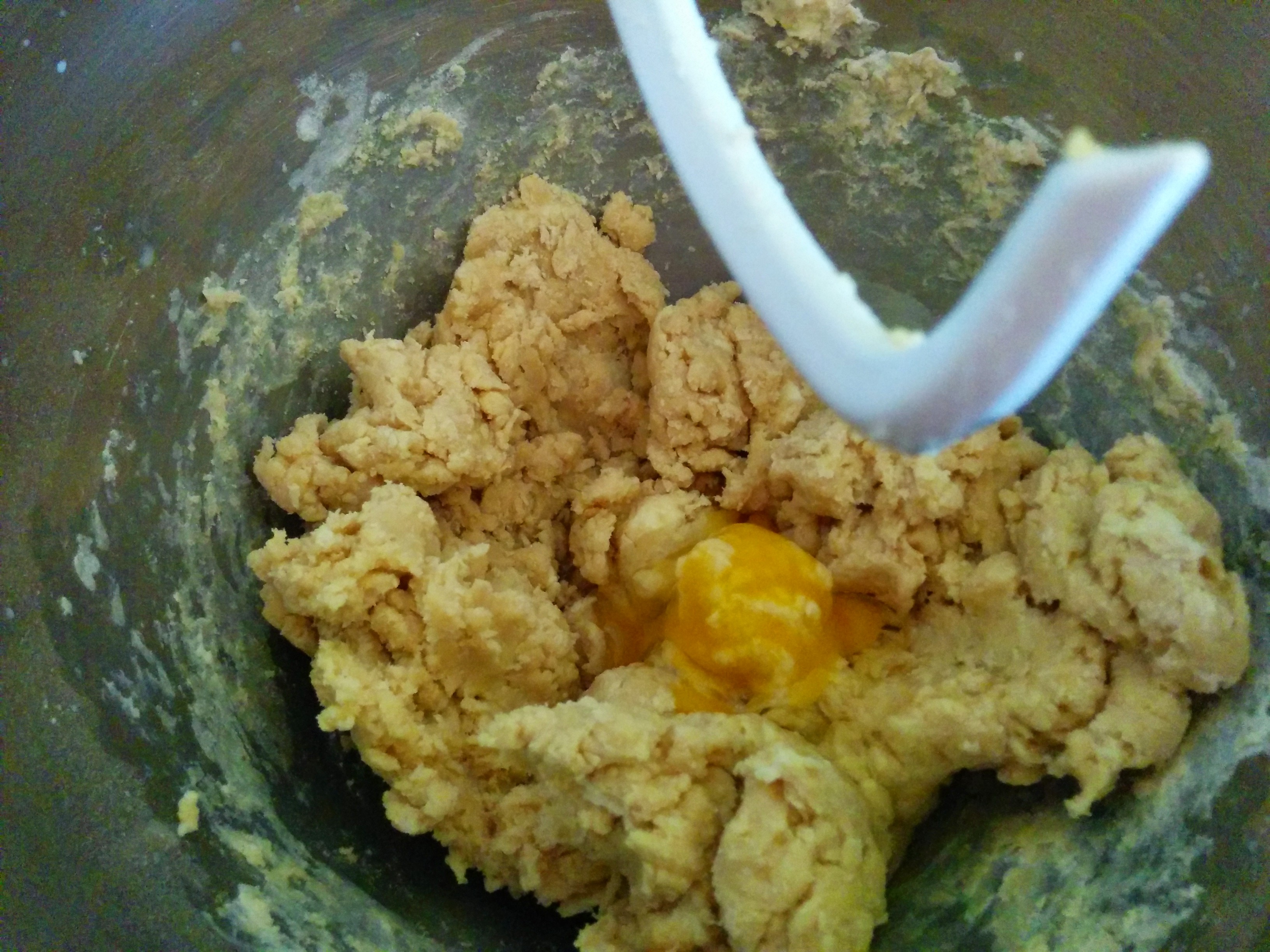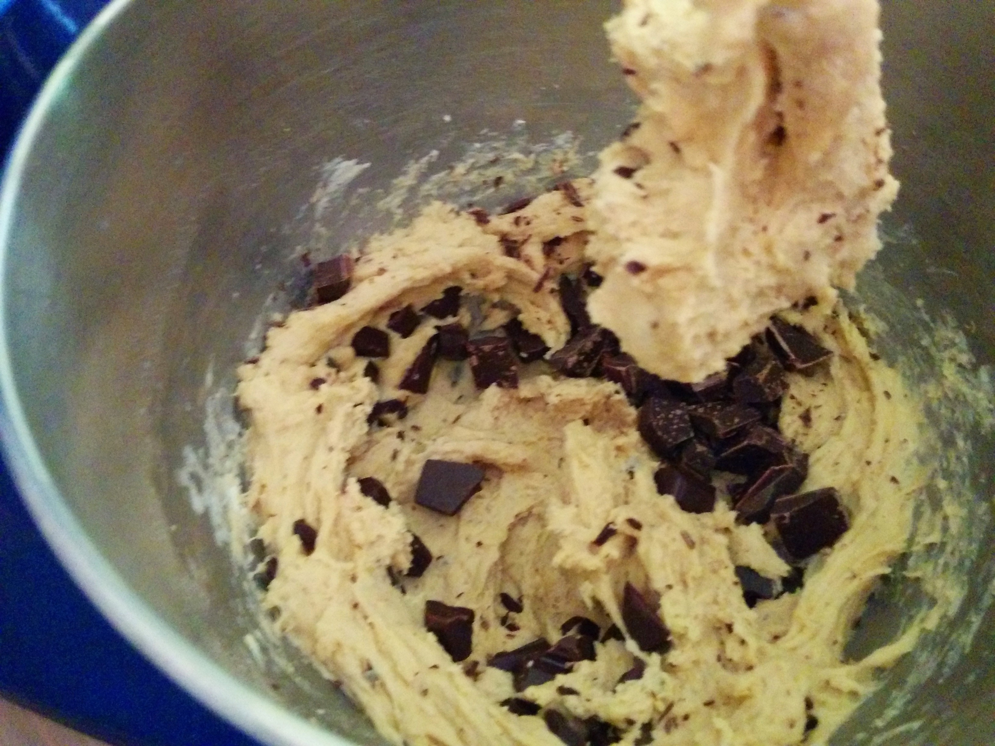 Versez lentement ce mélange à votre mélange de farine / sucre, en ajoutant également le beurre ramolli ainsi que l’œuf et les pépites de chocolat.