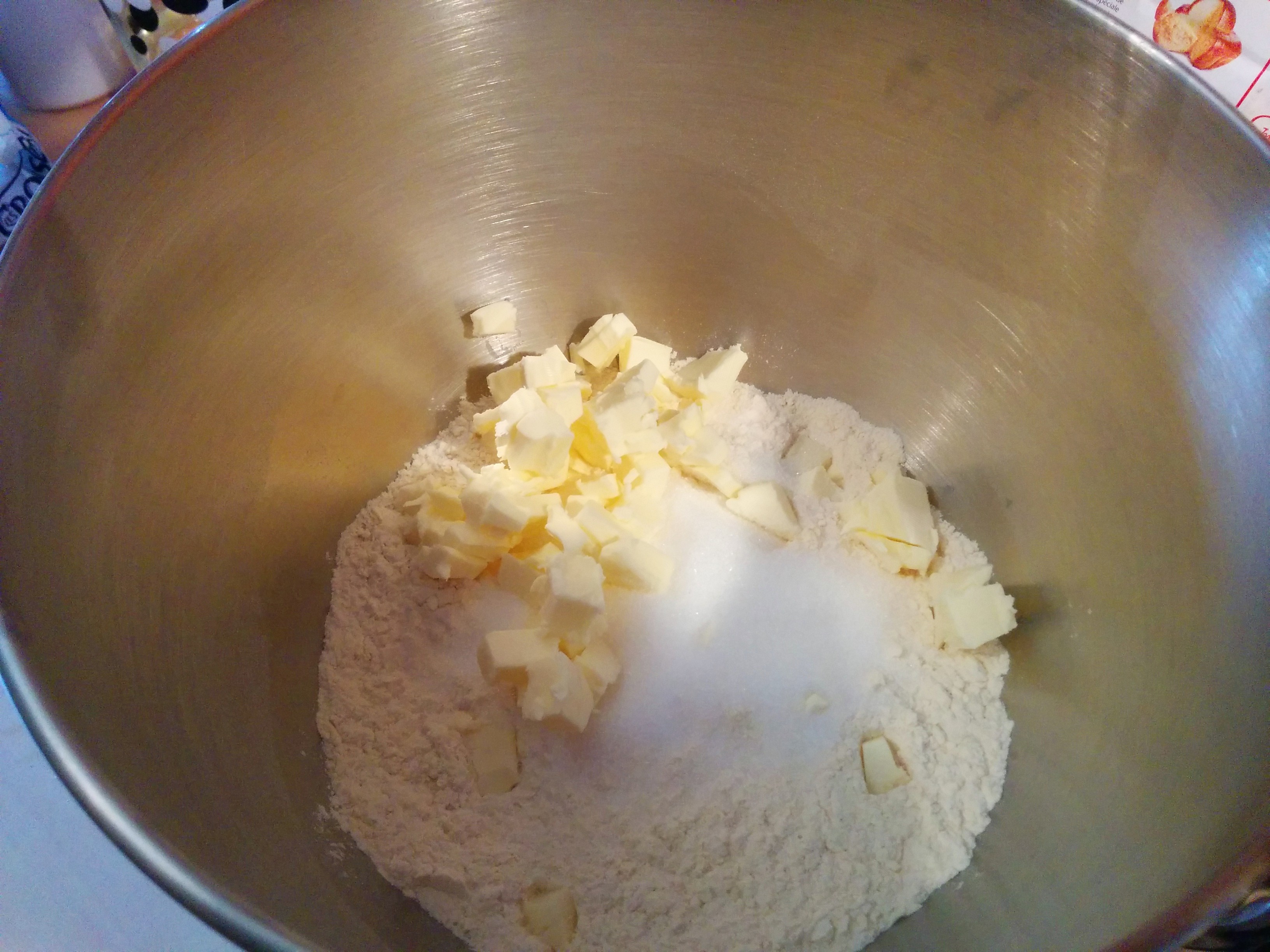 Mélangez dans le bol de votre robot la farine, le sucre et la pincée de sel.