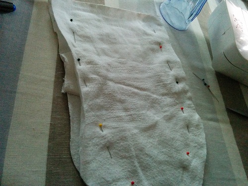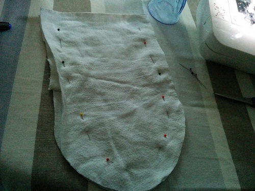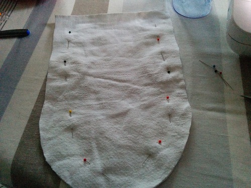 Puis épingler vos deux parties qui formeront le corps sur l’envers en veillant à glisser les deux oreilles entre les tissus, afin de les prendre dans votre couture. Coudre les tissus, puis retourner l’ensemble de votre ouvrage.