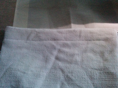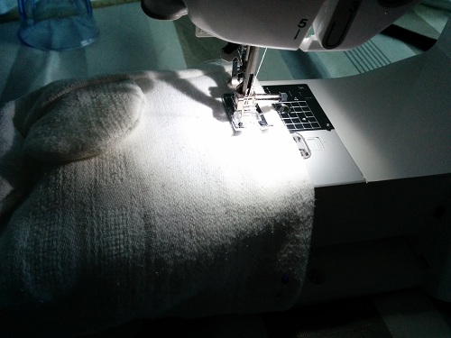 3/ Rabattre le haut de l’ouvrage (une fois retourné sur l’endroit) afin de faire un ourlet dans lequel nous passerons le ruban qui fermera le sac. Ne pas oublier de laisser 4 à 5 cm pour laisser sortir le ruban. (Commencer et terminer par une marche arrière afin que cela soit solide).