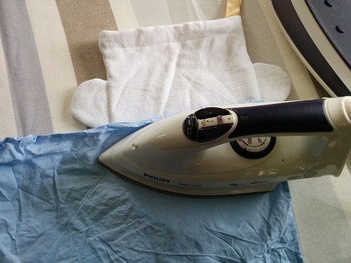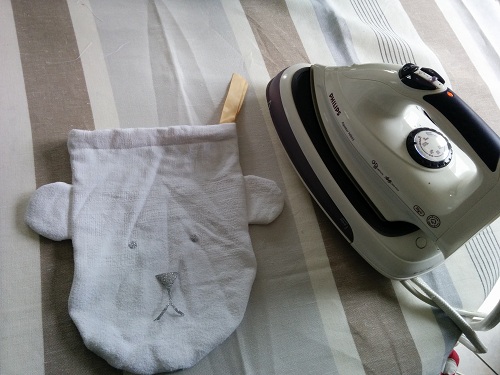 Découper et placer votre tissu thermocollant sur le sac, recouvrez-le d’un ligne fin, et fixer le tout à l’aide de votre fer à repasser.