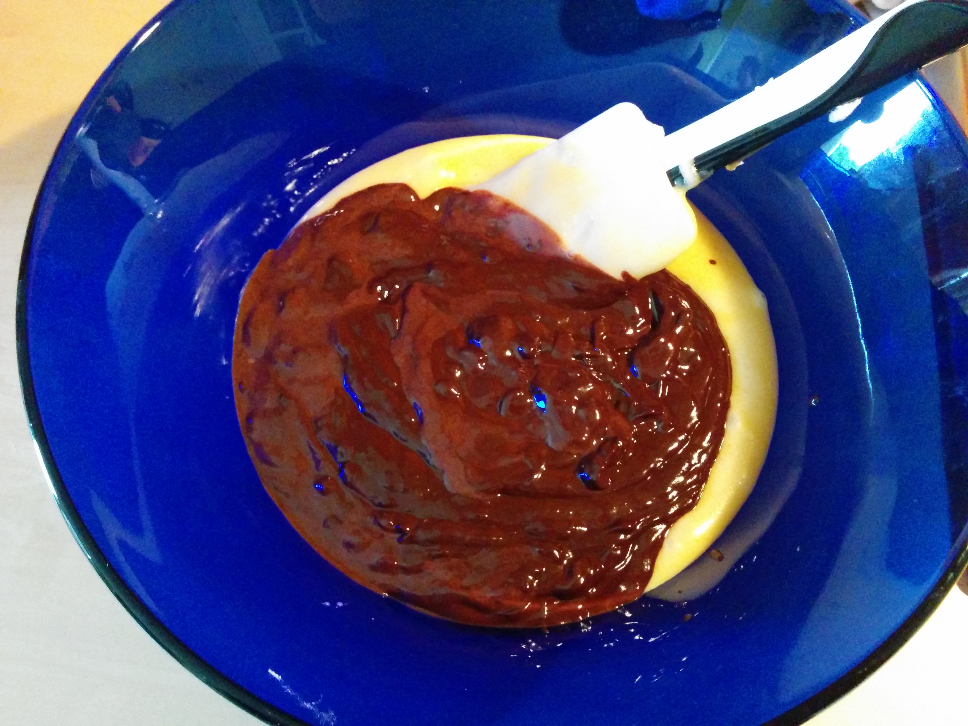 Diviser votre pâte en 2 portions : Ajouter dans l’une le chocolat fondu et dans l’autre la banane écrasée (vous pouvez y ajouter selon votre gout un peu de rhum)