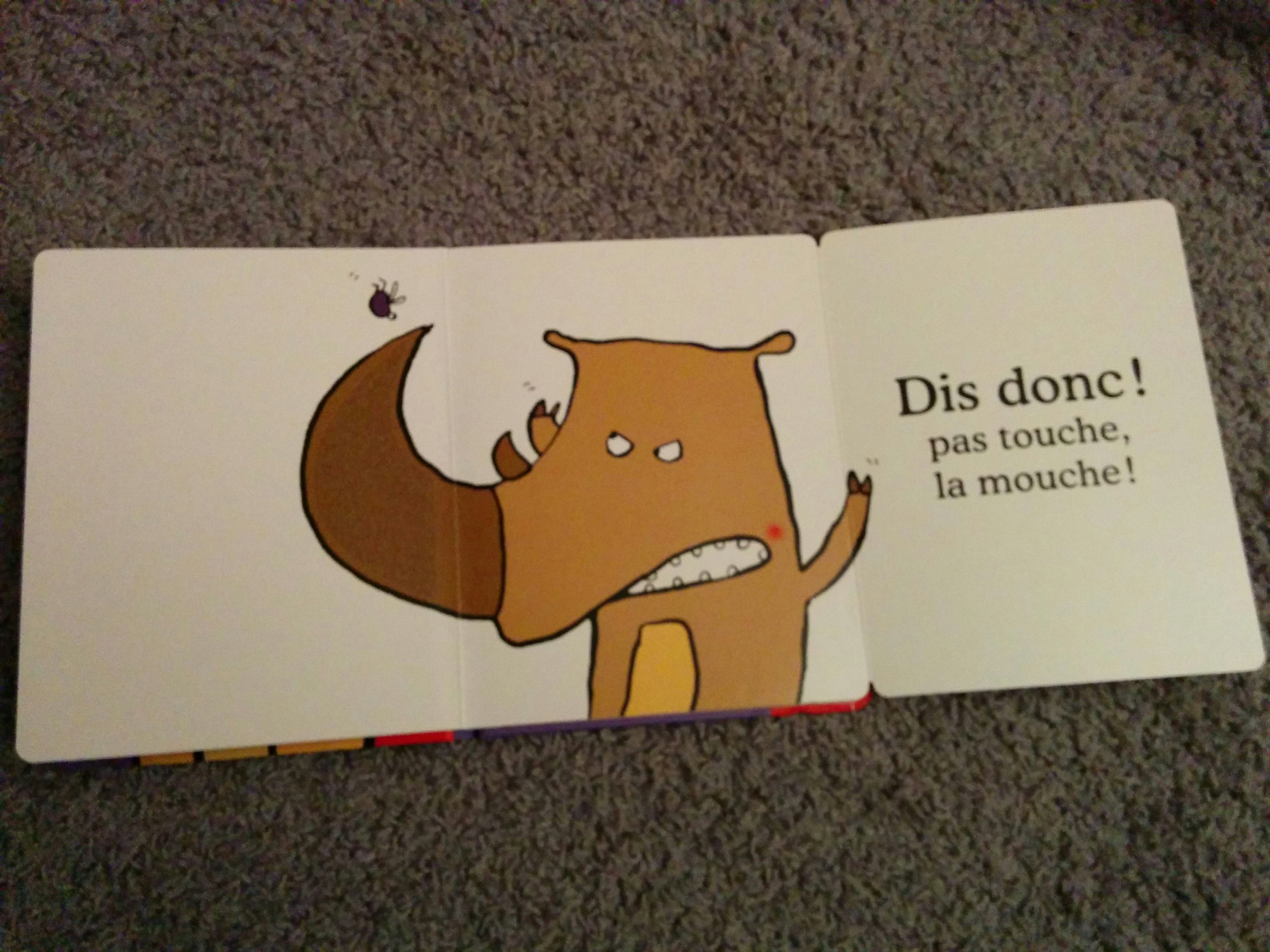 Un drôle de livre plein de flaps pour s’amuser, avec la mouche, à découvrir et toucher des animaux grognons, en effet cette petite mouche coquine va voler d’animaux en animaux, qui seront tous agacés de la voir se poser sur eux 😉