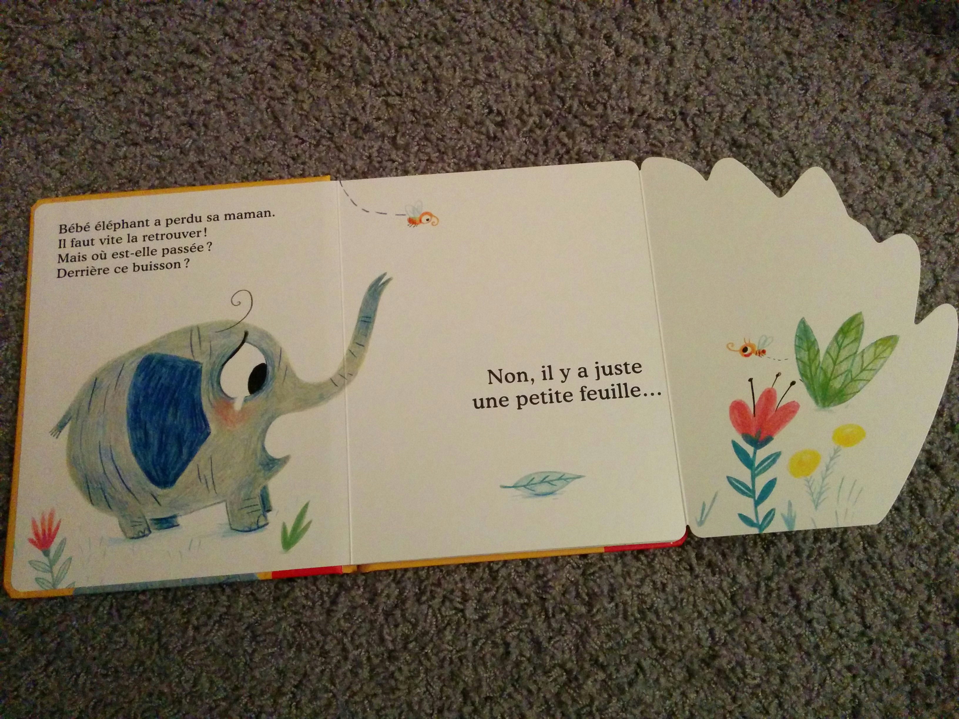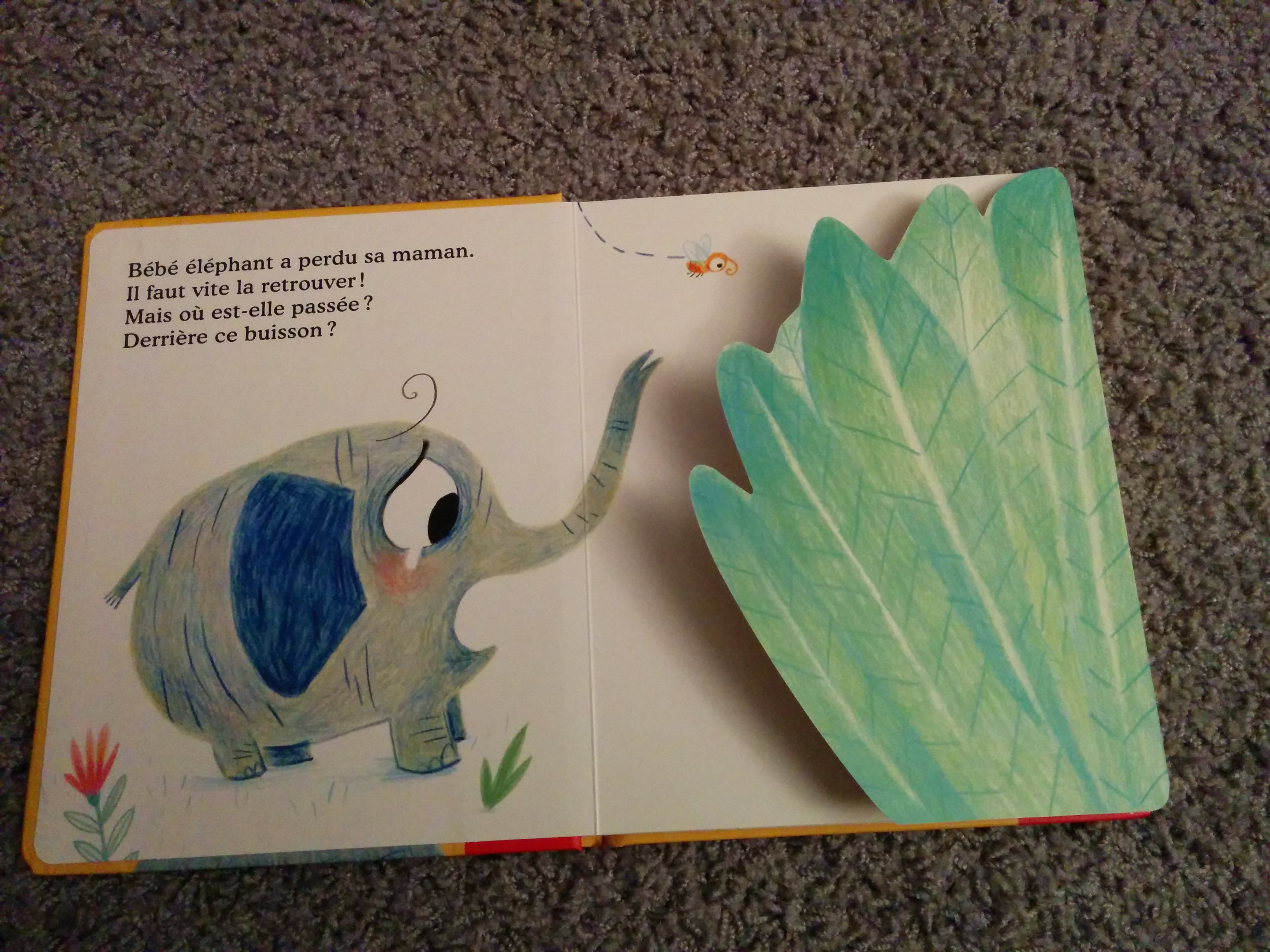 Un drôle de livre plein de flaps pour aider bébé éléphant à retrouver sa maman tout en se promenant dans la nature et en regardant derrière les fleurs et les buissons.