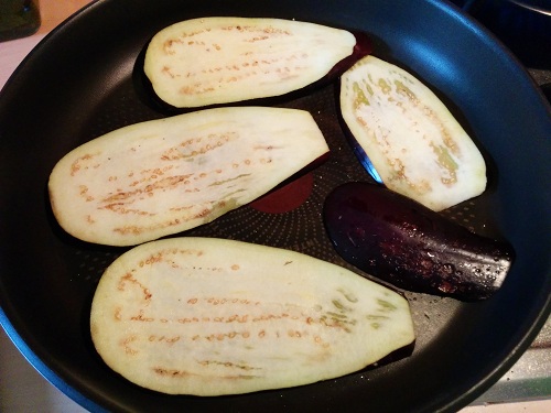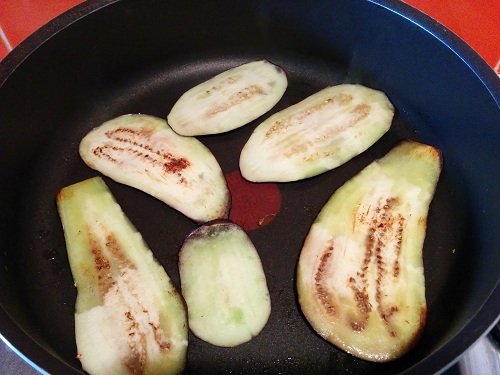 Mettez de l’huile d’olive dans une poêle, et faites revenir vos tranches d’aubergine jusqu’à ce qu’elles soient dorées et tendres. Disposez-les sur une assiette avec du papier absorbant et réservez.