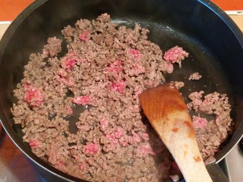 Faites ensuite revenir votre viande dans une poêle avec votre oignon et l’ail.