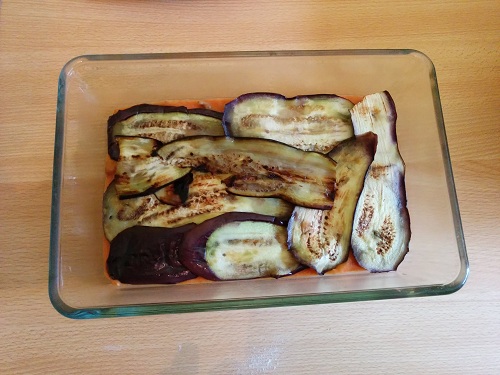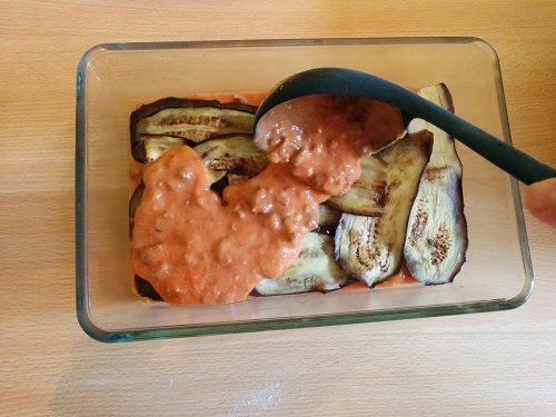 Dans un plat, commencez par mettre une couche de sauce tomate/viande, puis une couche d’aubergines …