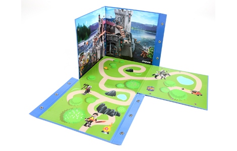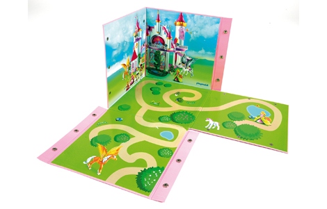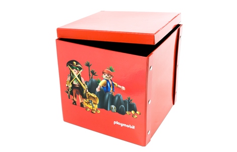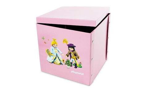 La boîte de jeu Playmobil est disponible en 4 univers : pirates, chevaliers, princesses, ferme. En position fermée, elle permet de ranger les jouets et en position ouverte, elle invite au jeu avec ses décors colorés.