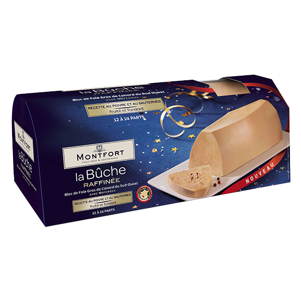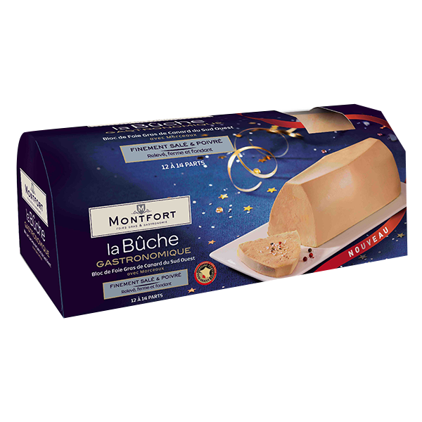 En glanant çà et là des idées de menus pour préparer Noël…. j’ai découvert la Bûche de Foie Gras Montfort.