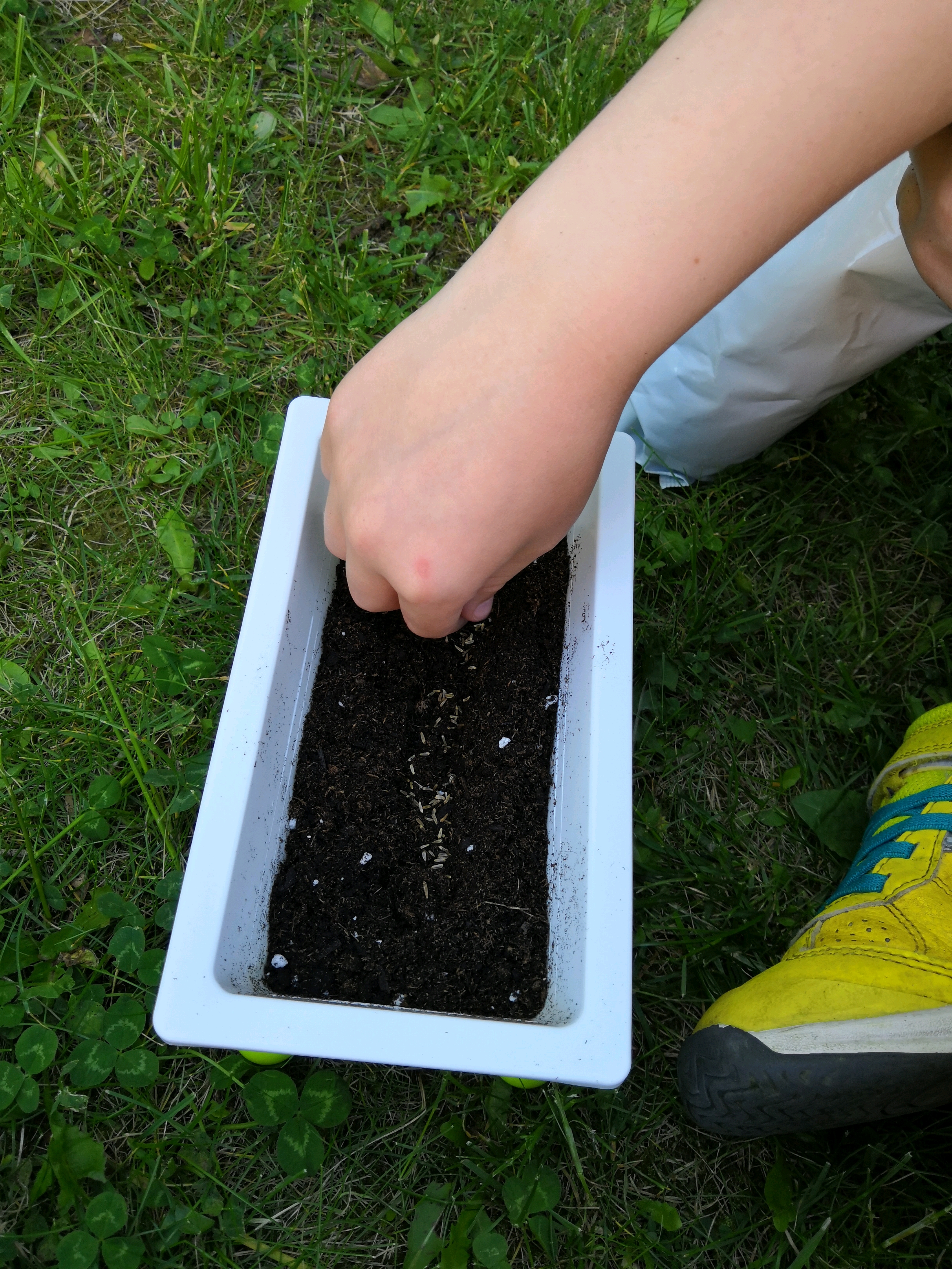 Après avoir étudié le kit sous tous les angles, force était de constater que nous allions devoir nous y mettre, c’est vrai que nous étions très pressés par les enfants qui n’avaient qu’une hâte, celle d’ouvrir le paquet de terreau et d’y mettre les mains dedans sans oublier le plaisir de semer les graines puis de les arroser ensuite (petit conseil, soyez vigilants sur la quantité d’eau pour l’arrosage, les enfants peuvent avoir la main lourde ! #ReRelol)